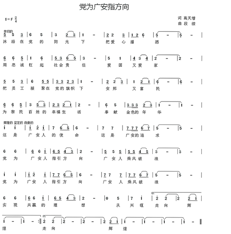沐浴在黨的陽(yáng)光下, 把愛(ài)心播灑;用忠誠(chéng)扛起社會(huì)責(zé)任, 愛(ài)國(guó)又愛(ài)家;把員工凝聚在黨的旗幟下, 安邦又富民;為黎民百姓的幸福生活, 奉獻(xiàn)金色的年華;這是廣安人的使命, 這是廣安的追求;黨為廣安人指引方向, 廣安人乘風(fēng)波浪;黨為廣安人指引方向, 廣安人乘風(fēng)波浪;實(shí)現(xiàn)共贏的理想, 從興旺走向輝煌, 走向輝煌。